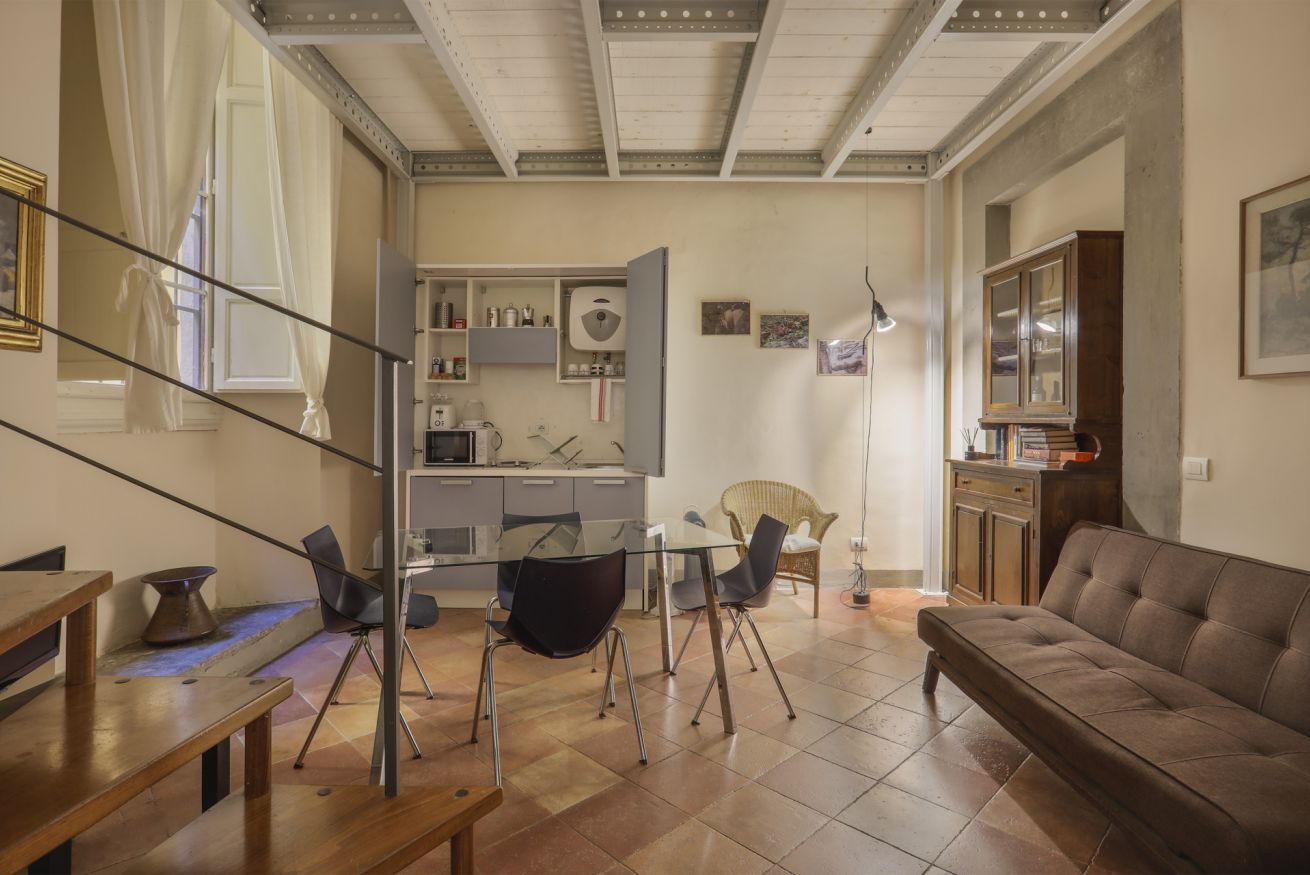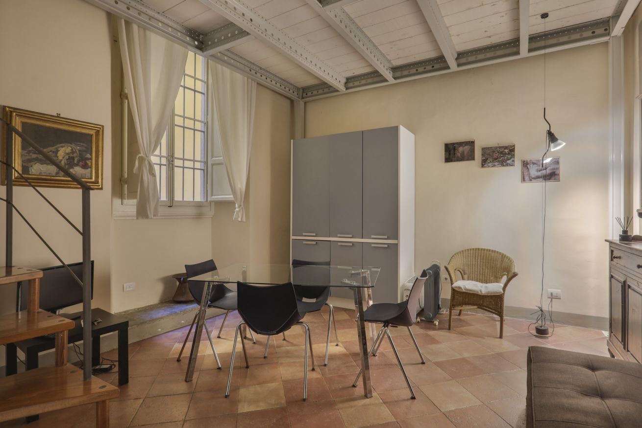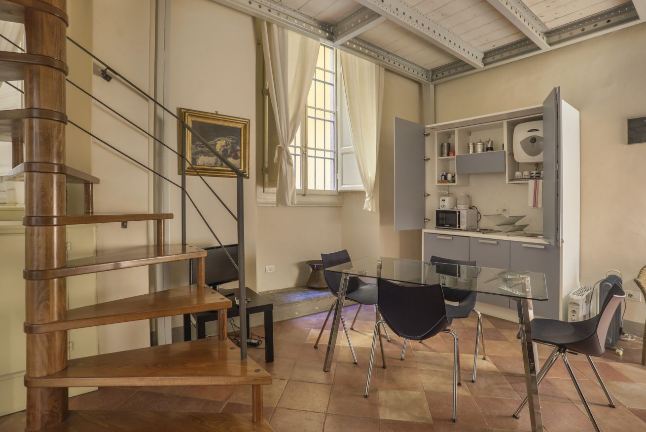 La disposizione interna separa l'area giorno dal reparto notte, rendendo l'appartamento una soluzione pratica e tranquilla per chi desidera soggiornare nel cuore di Firenze, all'interno di un contesto storico di rilievo.