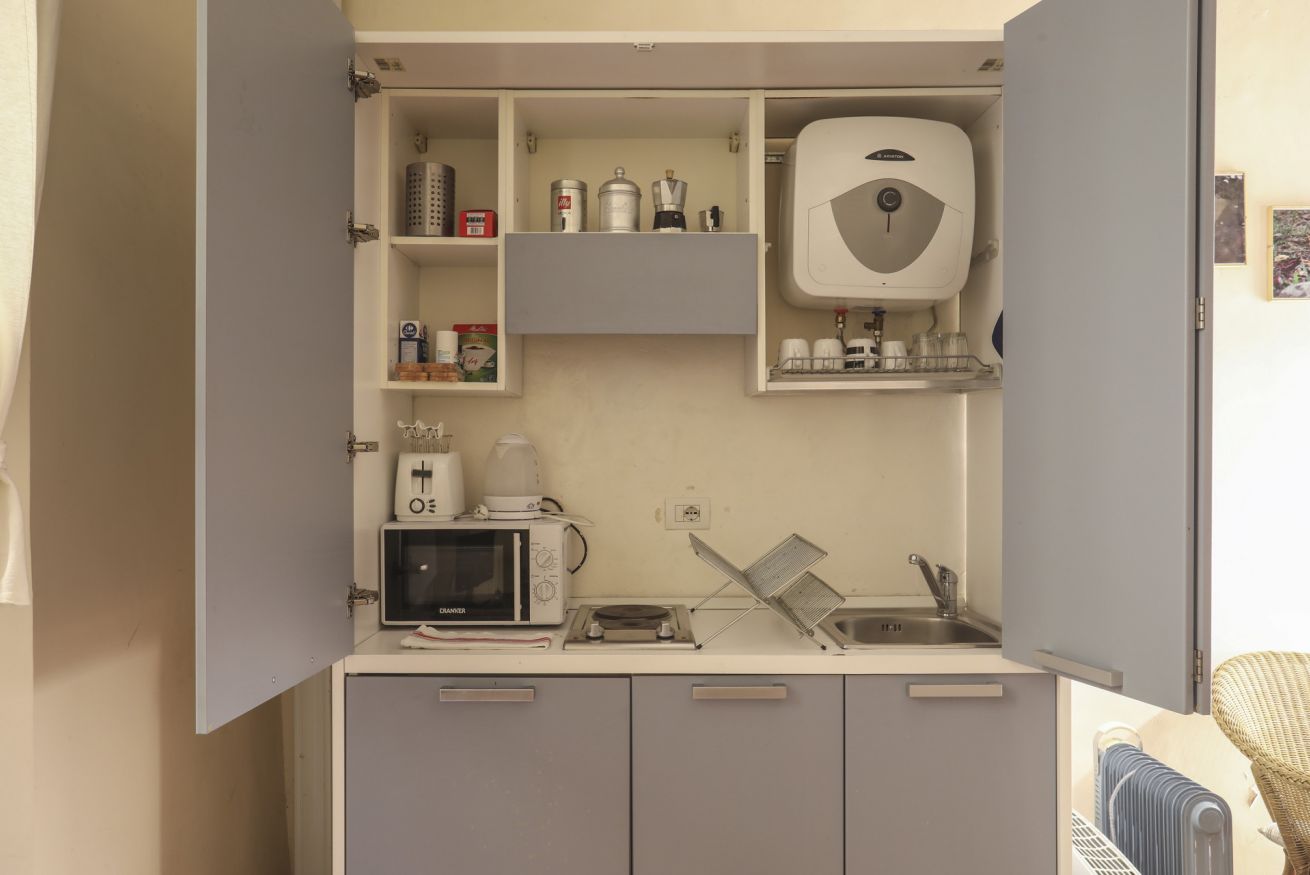 L’abitazione è posta al piano terra e si sviluppa su due livelli. Al piano d'ingresso si trova la zona living con un angolo cottura attrezzato, organizzato per offrire funzionalità in uno spazio compatto. Una scala in legno a chioccola interna conduce al piano superiore, interamente dedicato alla zona notte, dove si trovano la camera matrimoniale e il bagno.