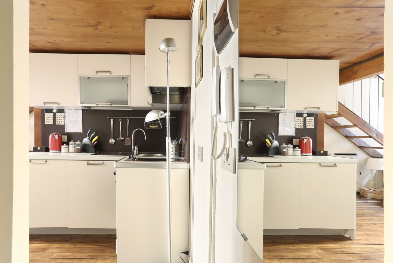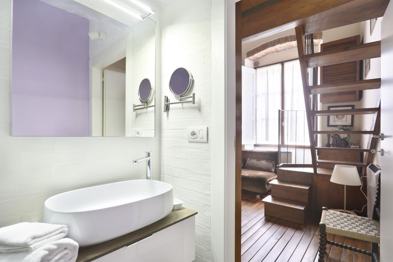 Sul lato sinistro c'è il bagno, completamente rinnovato nel marzo 2019, e la camera da letto si trova nel soppalco al piano superiore, dove c’è anche un ripostiglio / armadio per mettere i bagagli durante il vostro soggiorno, e una smart tv (è possibile utilizzare il proprio account Netflix senza dover collegare il computer).