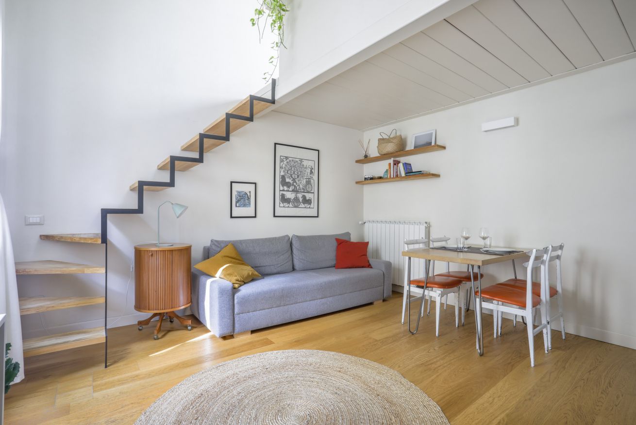 Step inside our stunning loft apartment with a private terrace overlooking the inside lage patio, therefore very quiet. The spacious room is filled with plenty of natural light and features a brand new kitchenette and a complete bathroom with a shower. Climb up to the mezzanine to find a comfortable double bed, making the apartment bright, welcoming, and cozy. The sofa can also be converted into an additional double bed, perfect for children. Clean sheets and towels will be provided for the number of guests.