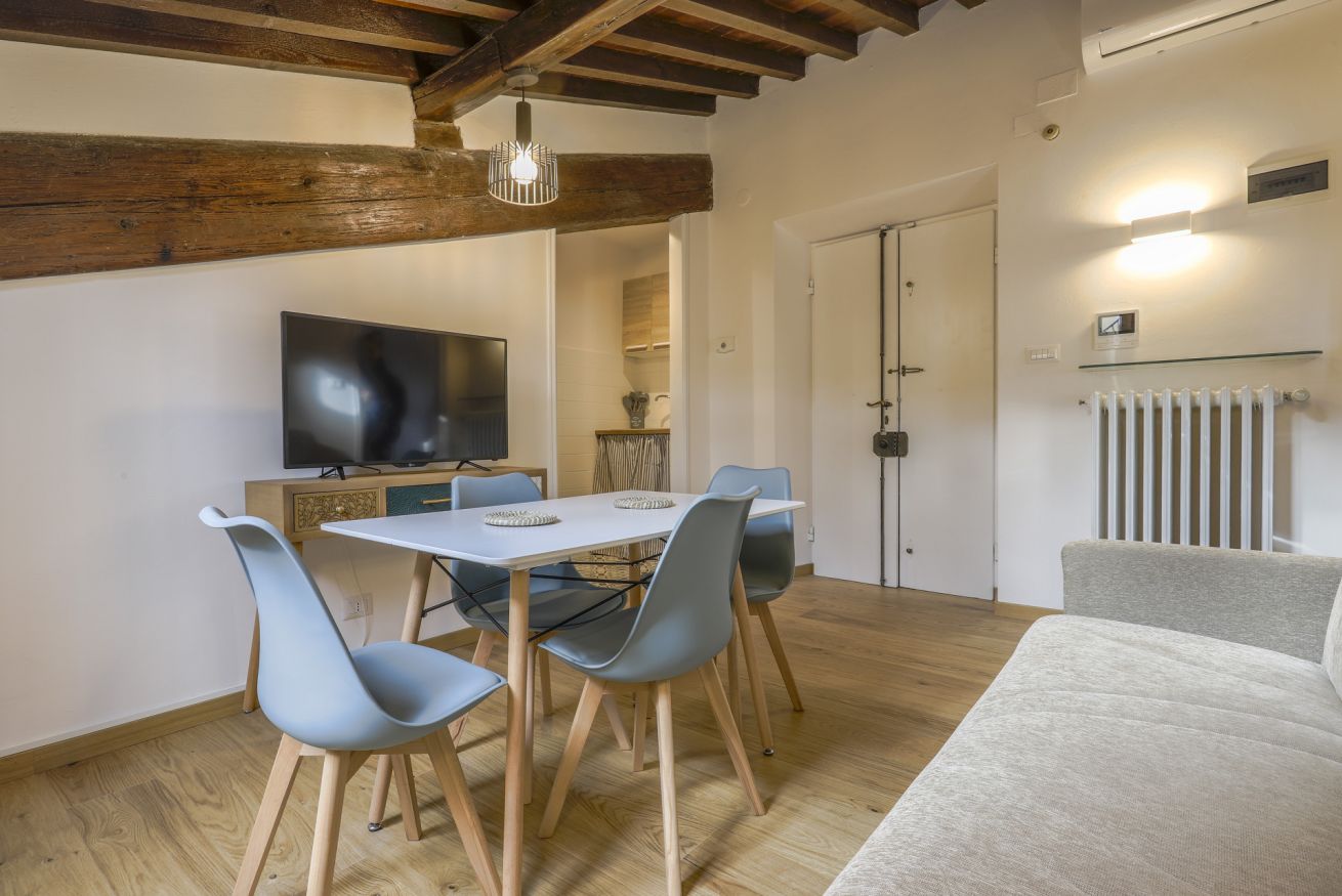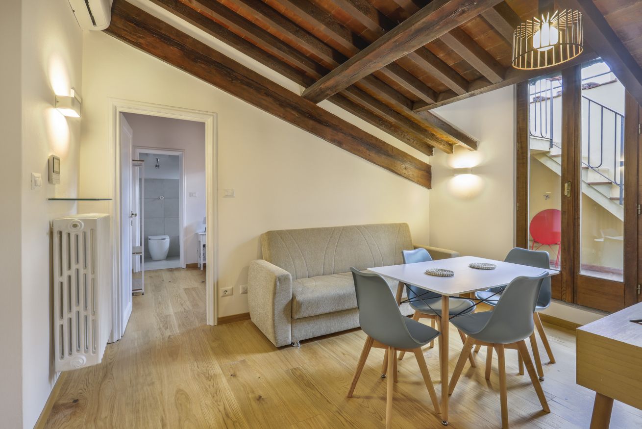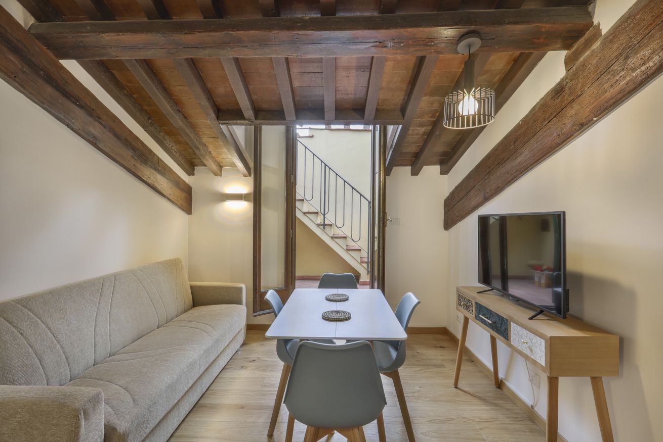 Scoprite l'apice dell'eleganza fiorentina nel nostro monolocale situato all'interno dell' storico Palazzo Borghese. Questo squisito rifugio offre una perfetta combinazione di comfort moderno e fascino senza tempo, rendendolo un luogo ideale per il vostro soggiorno a Firenze. Entrando nell'appartamento, il soggiorno accoglie con la sua atmosfera invitante. Rilassatevi sul divano e godetevi l'intrattenimento sul Televisore smart, creando un'atmosfera rilassante. A destra, vi aspetta un angolo cottura ben fornito, pronto per le vostre avventure culinarie nel cuore di Firenze. A sinistra, trovate tranquillità nella camera da letto adornata con un confortevole letto matrimoniale, garantendo un riposo notturno dopo una stancante giornata in città. Il bagno, completo con doccia, offre comodità e servizi moderni.