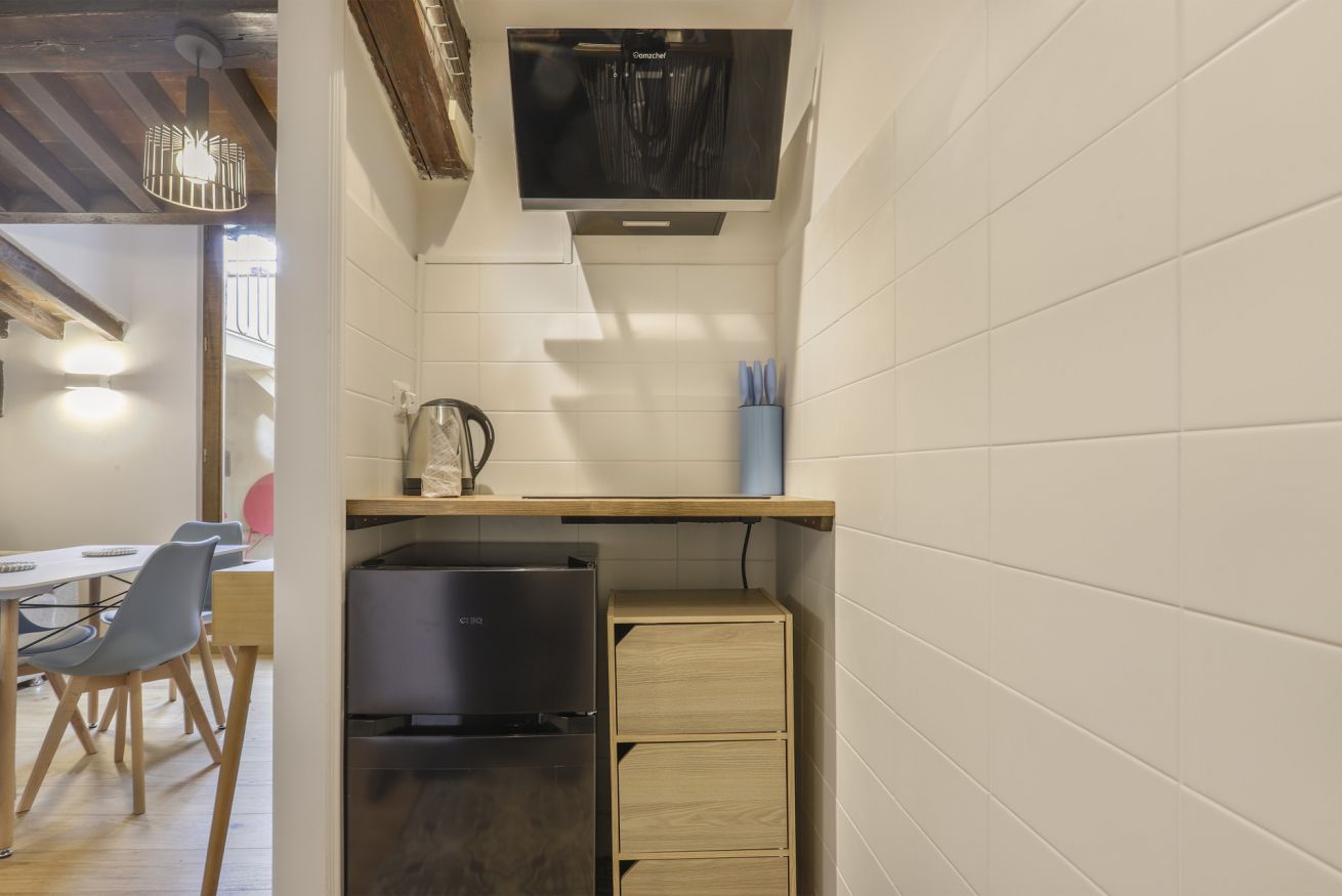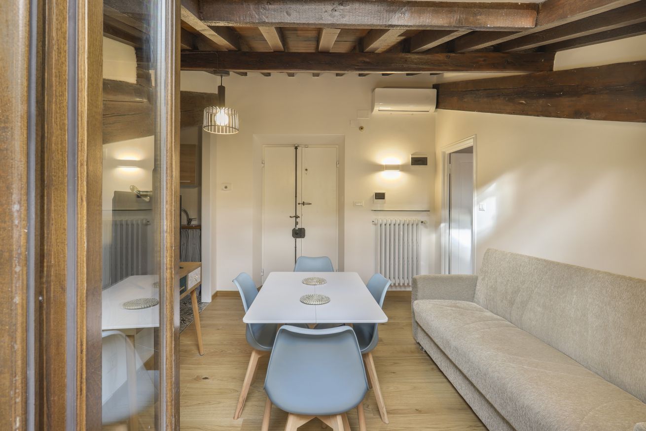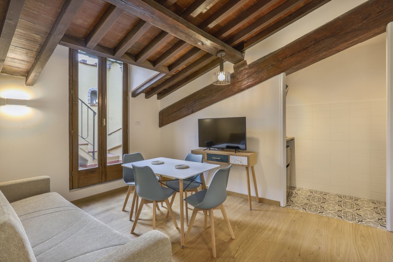 Scoprite l'apice dell'eleganza fiorentina nel nostro monolocale situato all'interno dell' storico Palazzo Borghese. Questo squisito rifugio offre una perfetta combinazione di comfort moderno e fascino senza tempo, rendendolo un luogo ideale per il vostro soggiorno a Firenze. Entrando nell'appartamento, il soggiorno accoglie con la sua atmosfera invitante. Rilassatevi sul divano e godetevi l'intrattenimento sul Televisore smart, creando un'atmosfera rilassante. A destra, vi aspetta un angolo cottura ben fornito, pronto per le vostre avventure culinarie nel cuore di Firenze. A sinistra, trovate tranquillità nella camera da letto adornata con un confortevole letto matrimoniale, garantendo un riposo notturno dopo una stancante giornata in città. Il bagno, completo con doccia, offre comodità e servizi moderni.
