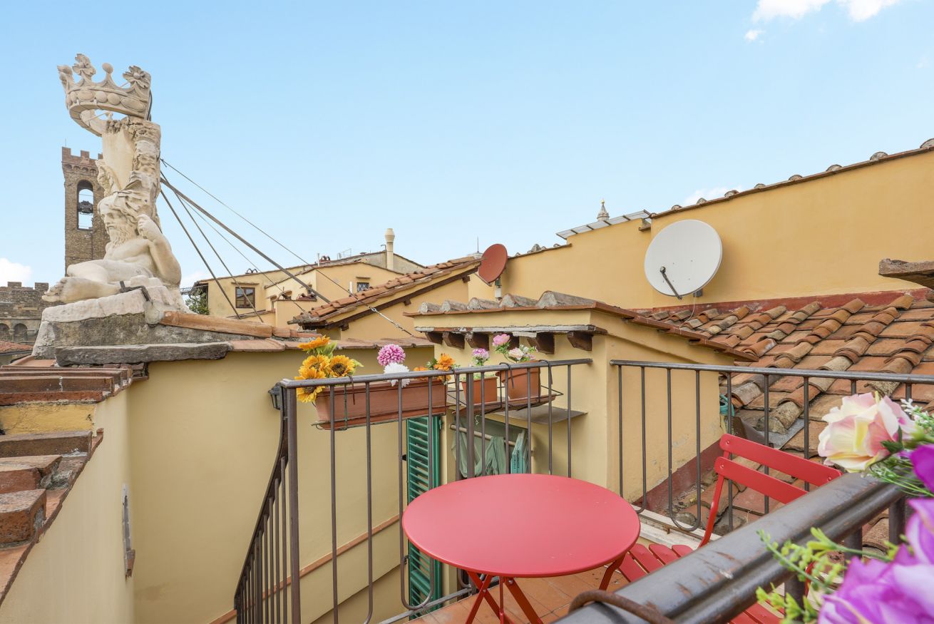 Uno dei momenti clou di questa residenza è l'accesso alla doppia terrazza dal soggiorno. Uscite e sarete accolti da un piccolo, incantevole primo terrazzo. Salendo una piccola scala scoprirete una gemma nascosta: un terrazzino più piccolo ma splendidamente realizzato, perfetto per momenti intimi e che offre viste panoramiche del centro città e dei suoi monumenti iconici. Lo Studio Palazzo Borghese vi invita a vivere Firenze nel lusso e nello stile, unendo il fascino della storia con i comfort della vita contemporanea. Palazzo Borghese è letteralmente a pochi passi dal Palazzo Museo del Bargello e pochi minuti a piedi da Santa Croce, dal Duomo e da Palazzo Vecchio in Piazza della Signoria. Naturalmente siete nella zona dello shopping, circondati da boutique, bar e trattorie di ogni tipo.