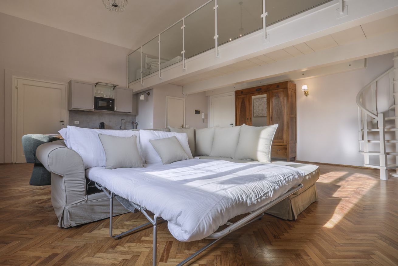La disposizione degli spazi è studiata per offrire il massimo comfort. Il livello principale comprende un'ampia zona giorno con un comodo divano, trasformabile in letto per ospitare due persone extra in caso di necessità, un tavolo da pranzo e una cucina a vista completamente attrezzata, oltre a un bagno moderno e curato. Per garantire un soggiorno piacevole in ogni stagione, l’appartamento è dotato di impianto di climatizzazione e riscaldamento. Un accogliente soppalco si affaccia sul salotto, ospitando un confortevole letto matrimoniale.