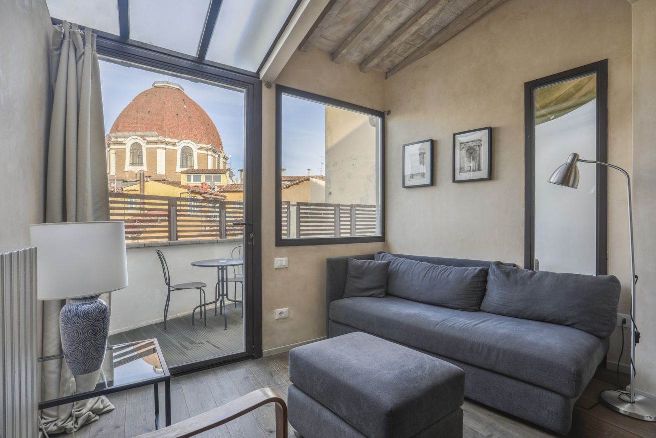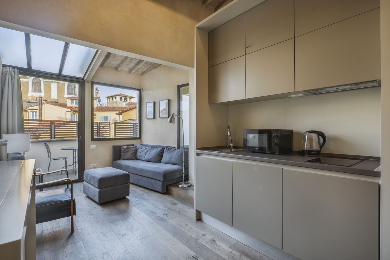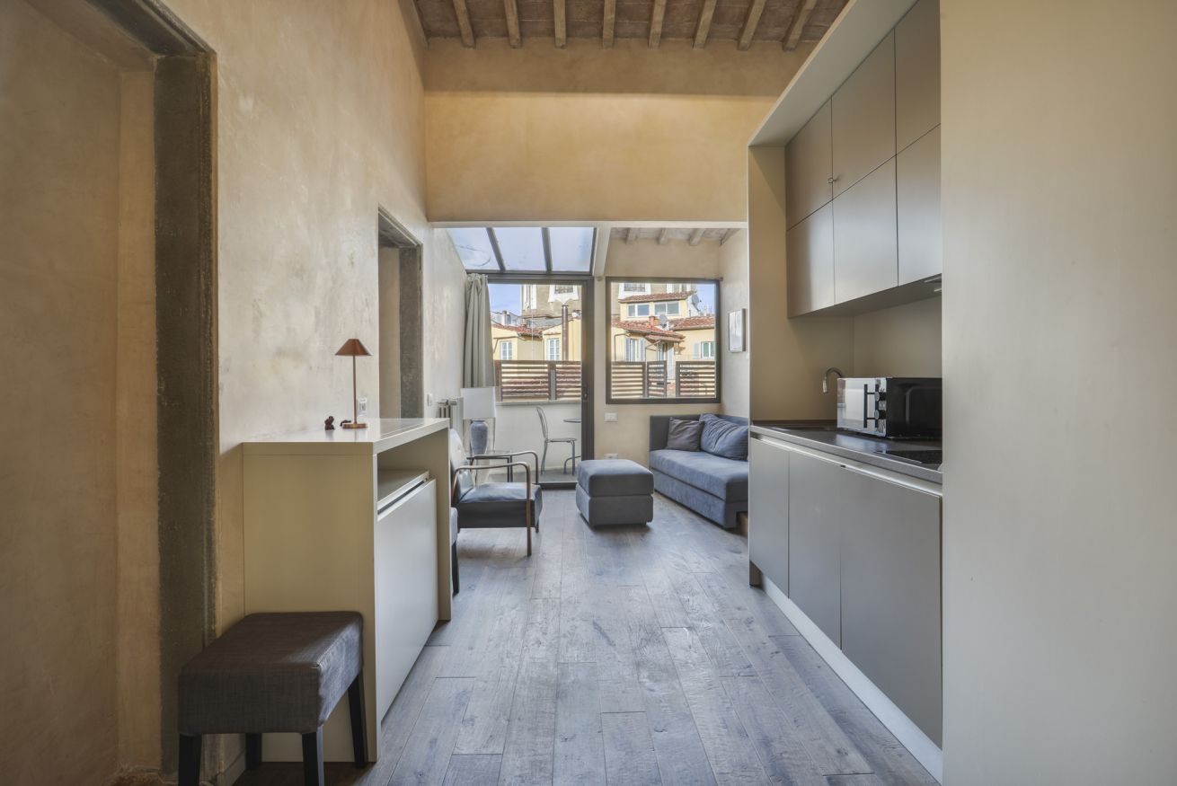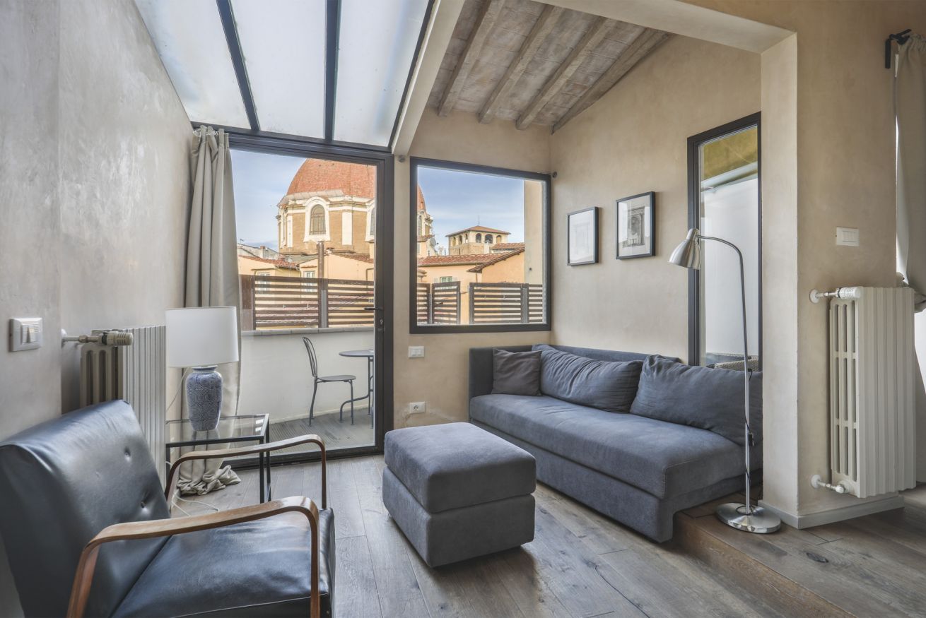 Le ampie finestre e il lucernario garantiscono un’eccellente luminosità naturale, valorizzando le travi in legno a vista e le finiture dai toni caldi e neutri. La terrazza, arredata per vivere l’esterno, rappresenta uno spazio tranquillo dove rilassarsi sopra la città dopo una giornata a Firenze.