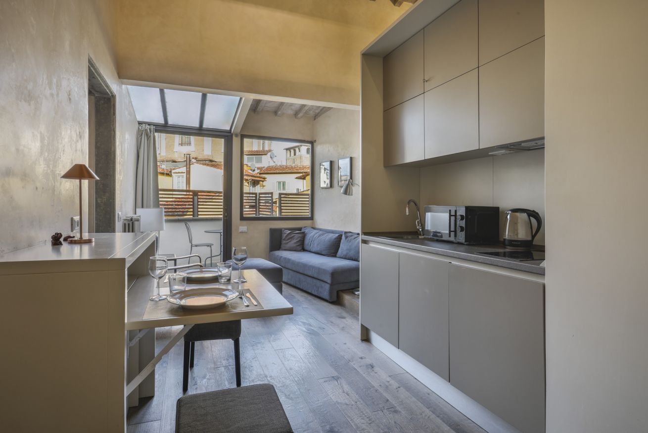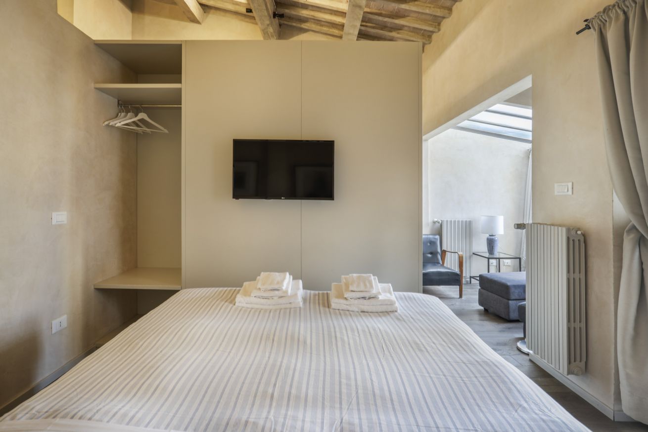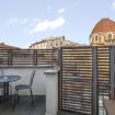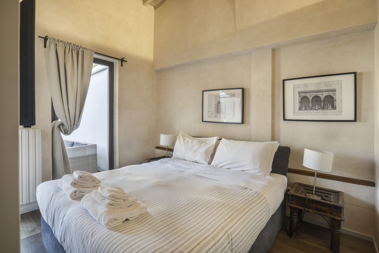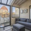 Le ampie finestre e il lucernario garantiscono un’eccellente luminosità naturale, valorizzando le travi in legno a vista e le finiture dai toni caldi e neutri. La terrazza, arredata per vivere l’esterno, rappresenta uno spazio tranquillo dove rilassarsi sopra la città dopo una giornata a Firenze.