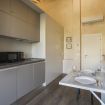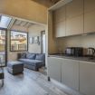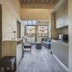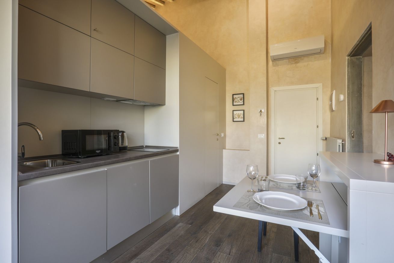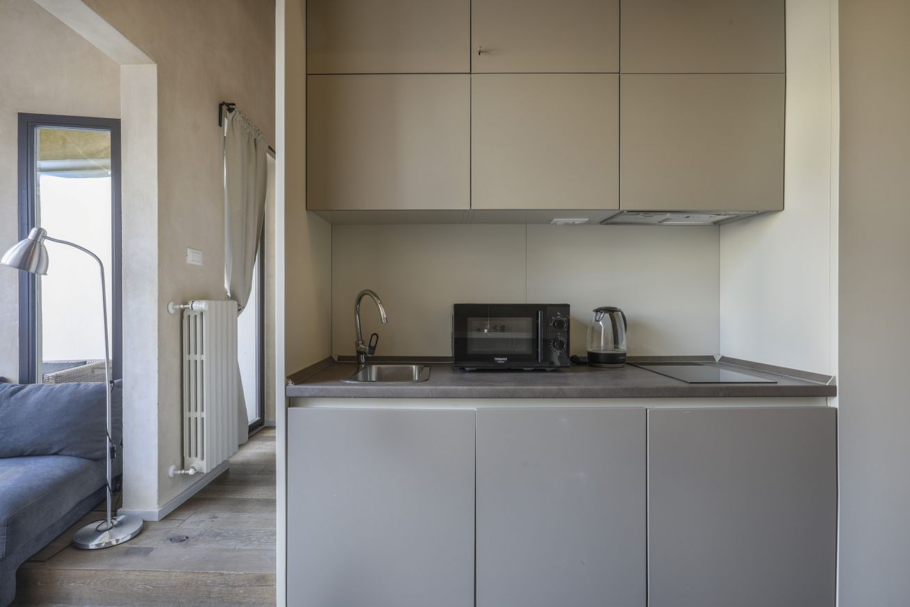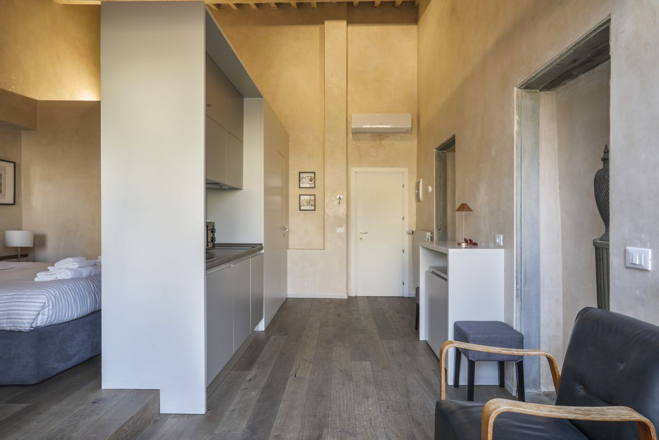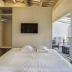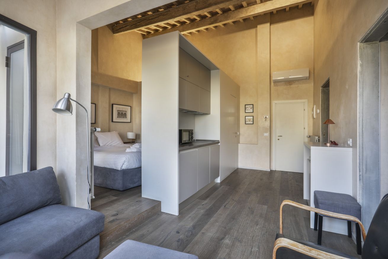 Le ampie finestre e il lucernario garantiscono un’eccellente luminosità naturale, valorizzando le travi in legno a vista e le finiture dai toni caldi e neutri. La terrazza, arredata per vivere l’esterno, rappresenta uno spazio tranquillo dove rilassarsi sopra la città dopo una giornata a Firenze.