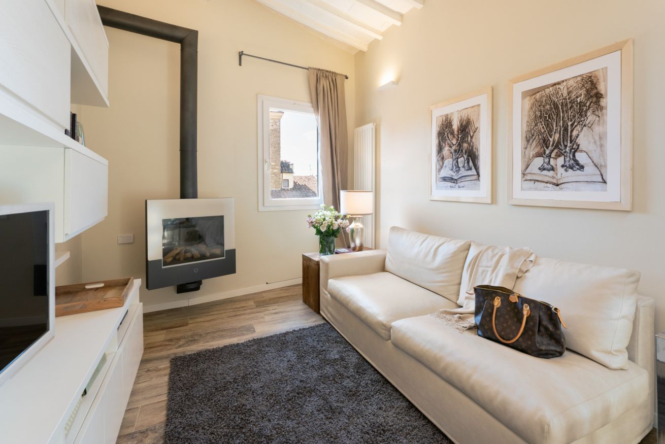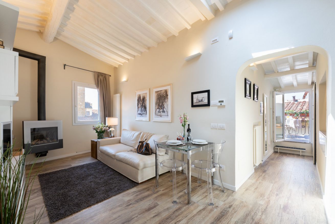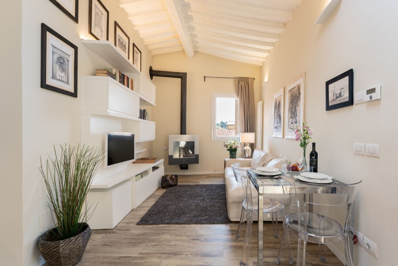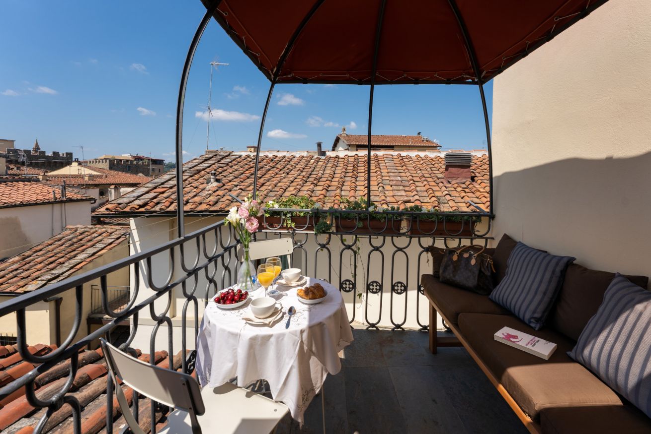L’appartamento è pensato per chi cerca stile, comodità e un angolo di pace in pieno centro. La camera da letto è ampia e confortevole, con un letto matrimoniale di qualità, biancheria soffice, un grande armadio su misura e toni rilassanti. Il soggiorno è elegante ma informale, dotato di un comodo divano letto, dettagli curati e una zona pranzo accogliente. Da qui si accede al vero gioiello della casa: un piccolo terrazzino privato con vista sui tetti di Firenze, perfetto per la colazione, un aperitivo al tramonto o un momento di relax ascoltando la città dall’alto.