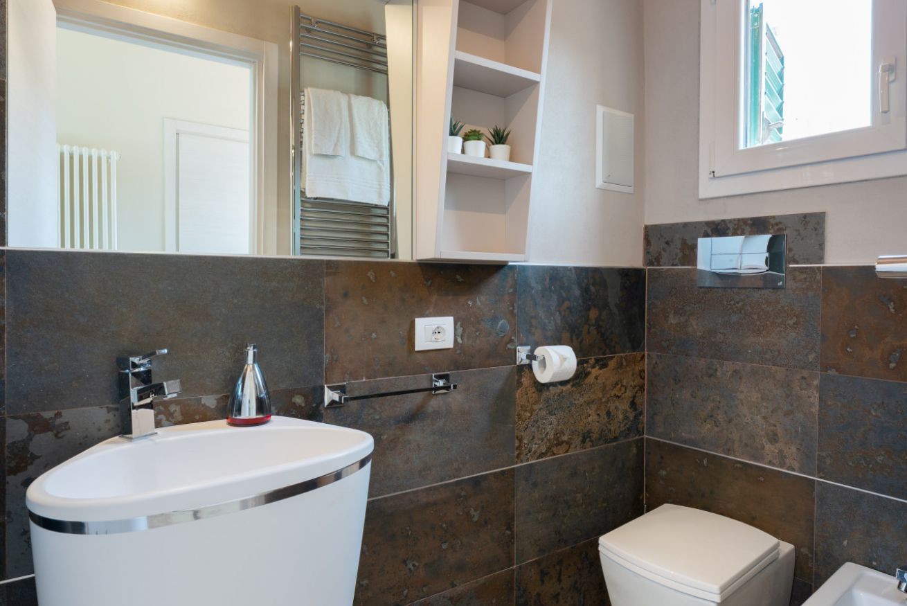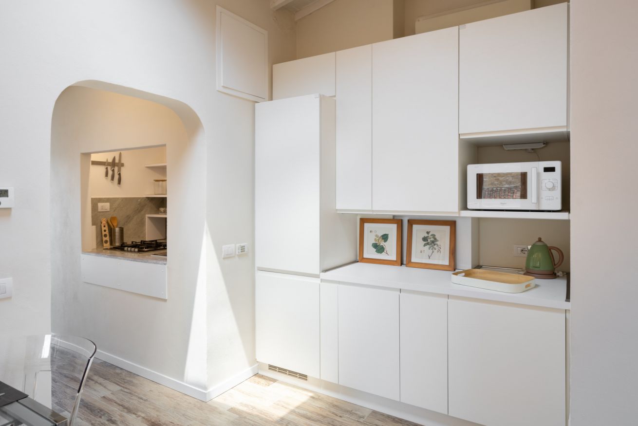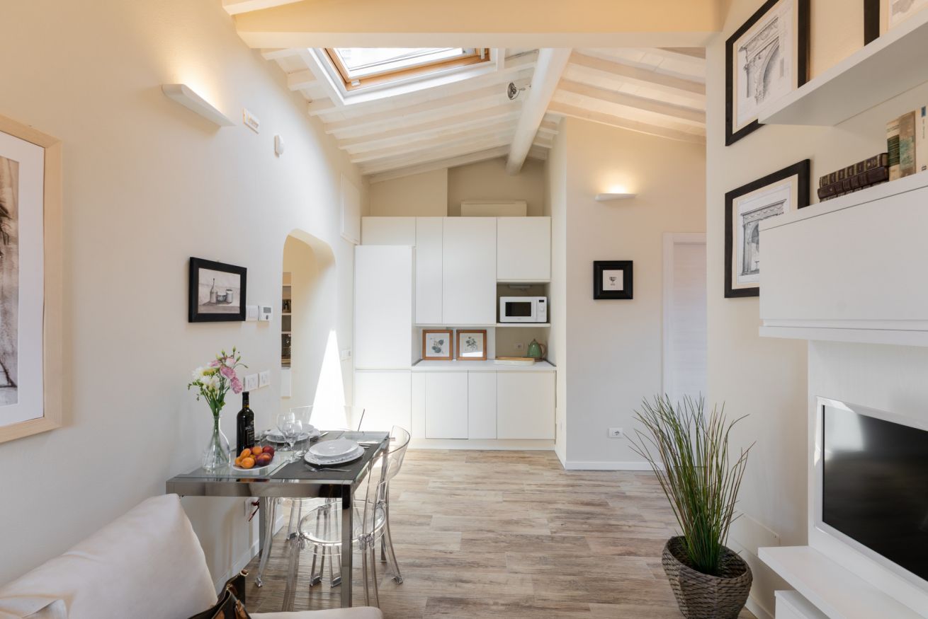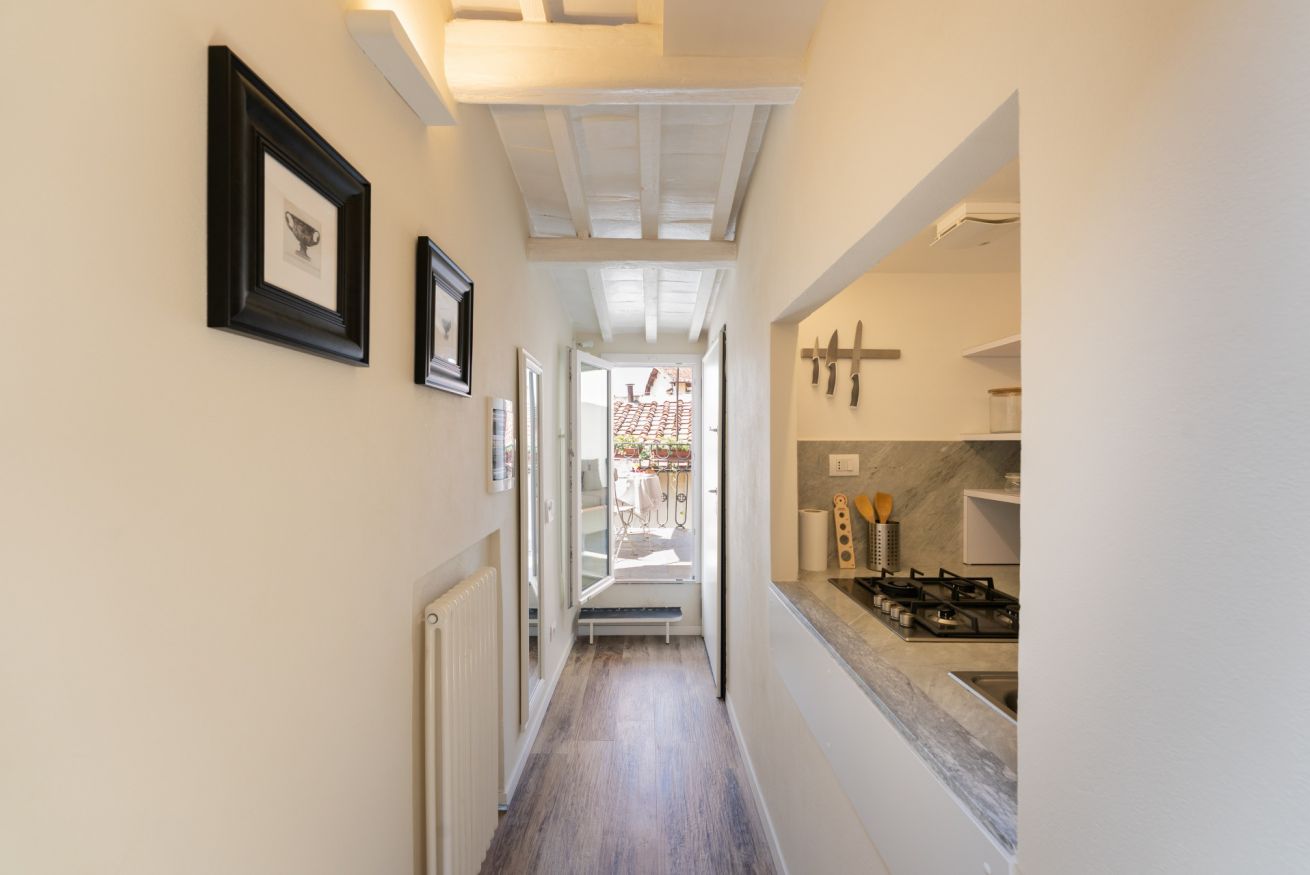 L’appartamento è pensato per chi cerca stile, comodità e un angolo di pace in pieno centro. La camera da letto è ampia e confortevole, con un letto matrimoniale di qualità, biancheria soffice, un grande armadio su misura e toni rilassanti. Il soggiorno è elegante ma informale, dotato di un comodo divano letto, dettagli curati e una zona pranzo accogliente. Da qui si accede al vero gioiello della casa: un piccolo terrazzino privato con vista sui tetti di Firenze, perfetto per la colazione, un aperitivo al tramonto o un momento di relax ascoltando la città dall’alto.